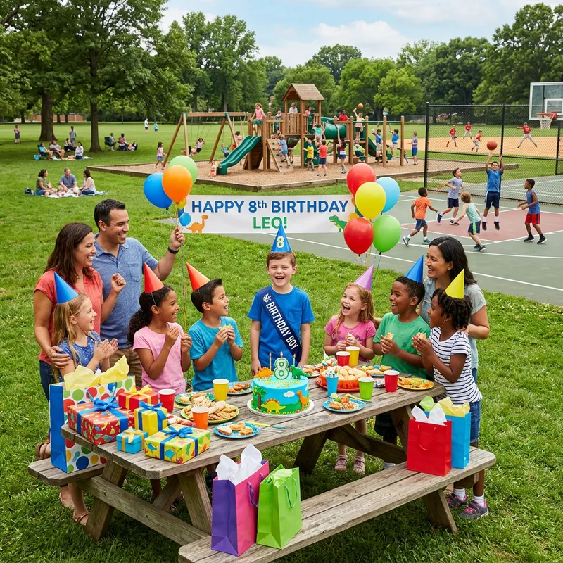 Illustrate a lively birthday celebration unfolding at a park. The standout of this scene is the 8-year-old birthday boy, who is happily participating in the festivities. Centered in the image, notice a wooden picnic table abundantly covered with an array of gifts, assorted party food, and an eye-catching, brightly frosted birthday cake. Around the picnic area, a lush grass field stretches out, adding a touch of nature's green to the scenery. Beyond it, a playground bustling with children enjoying different games serves as a vibrant backdrop. Next to it, a well-maintained basketball court with kids engaging in a friendly match. Close by, a baseball field with enthusiastic children taken up in a fun, casual game can be seen.