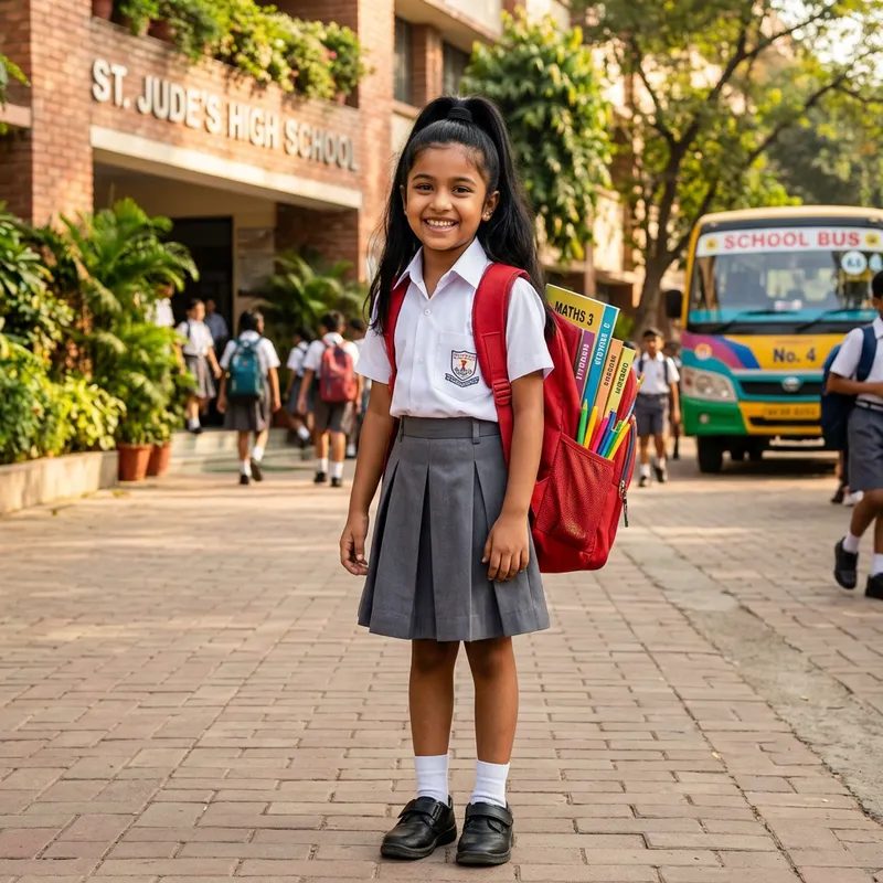 An 8-year-old South Asian girl, with a bright smile, wearing a uniform of white shirt and gray skirt. She has her long, black hair neatly tied up in a ponytail and she is carrying a red schoolbag on her shoulders. The schoolbag is filled with books and pencils peeking from it. She is standing fun-filled in the morning sun, ready to get on her day in school.