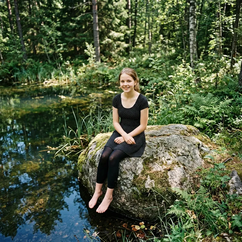 8k, photo, ultra real, a girl sitting on rock next to a forest pond, no shoes, small feet, she is weaing black tights and a short pokedot summer dress, she is smiling innocently at the viewer, view from above, girl looking up at viewer, forest, summers day, caucasian, petite, sixteen, cute, detailed, perfect eyes, full body.