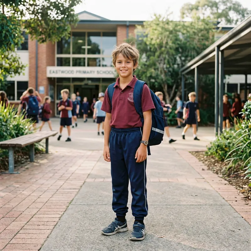 a 10 year old boy who is average size, has tanned skin, brown eyes, sandy brown hair - school uniform is navy trackpants and maroon polo top.