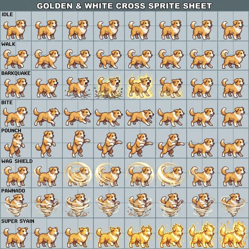 A 2d side scrolling game sprite sheet for a golden and white stocky border collie cross poodle for each move idle, various for walk, barkquake, bite, pounch (stands on hind 2 legs and punchs with 2 front legs), wag shield, pawnado, super syain.