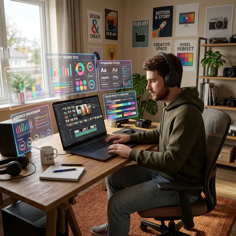 A 3D image of a male engrossed in operating a laptop. he explores the video editing online. Surrounding him are depictions of colorful virtual charts about graphics design. The laptop and guy set against a peaceful room background with graphic posters and soft natural lighting pouring in from a window.