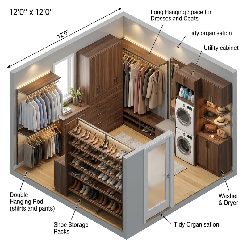 A 3D layout of a custom closet design measuring 12'x12'. The design includes: 1. Double hanging rods for shirts and pants on one wall. 2. A long hanging space for dresses and coats. 3. A drawer unit for folded clothes, located in a corner. 4. Shoe storage racks next to the hanging space. 5. Washer and dryer positioned in a corner of the closet. The design should be stylish and well-organized, featuring contemporary colors and materials like wood and steel.
