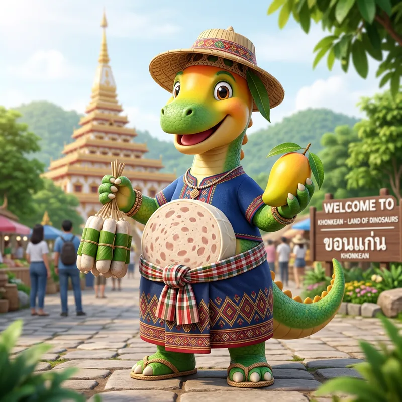 A 3D mascot for Khonkean province, Thailand by combining these popular things: dinosaur, white pork sausage, mango with north-east Thailand clothes.