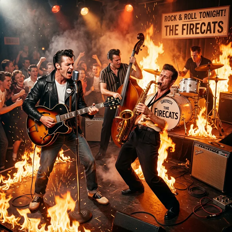 A 50s Rock and Roll quartet band: guitar player who also sings, the bass player, the drums player and the saxophone player in heat playing on fire.