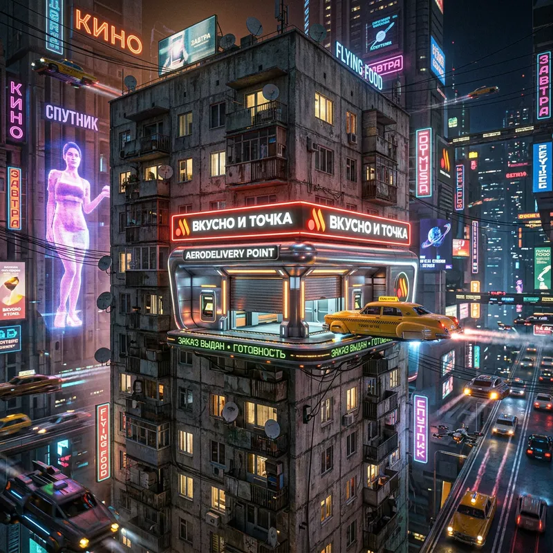 A 9-story Khrushchyovka (Soviet-era apartment building) with weathered concrete and old balconies. On the 6th floor, there is a futuristic fast-food restaurant called 'Vkusno i Tochka' — designed only for flying cars. The restaurant has a sleek neon sign in Cyrillic and drive-thru shutters like an airborne delivery point. The entire scene is styled like the movie 'The Fifth Element': vibrant cyberpunk atmosphere, glowing advertisements, busy flying car traffic, and vertical urban density. It's nighttime, with glowing city lights and a chaotic, futuristic vibe. The setting is summer, with hints of warmth and clear skies.