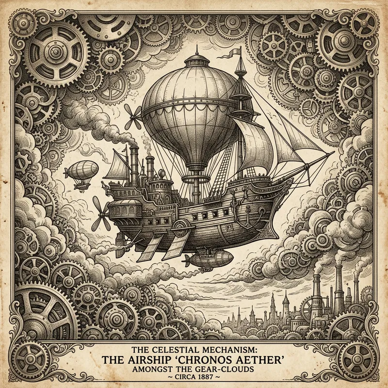 A steampunk-inspired flying ship soaring through clouds made of clockwork gears in the style of a vintage etching.