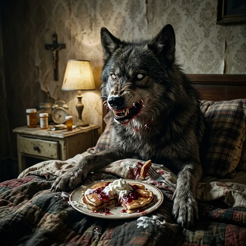An angry wolf possessed by the devil eating pancakes with whipped cream and jam in a bed, inspired by the horror movie The Exorcist. It has possessed eyes and mouth open. The pancakes have been half eaten and the wolf has cream and jam on its face.