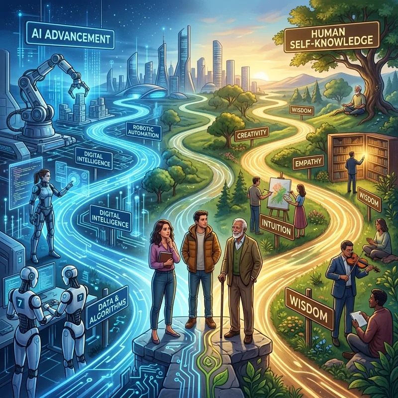 A balanced composition showing intertwined paths of AI advancement and human self-knowledge. One side shows robotic automation and digital interfaces, while the other shows uniquely human qualities like creativity, intuition, and empathy. Human figures standing at a crossroads between technological progress and inner wisdom. Warm golden light highlighting the human elements against cool blue technological elements.