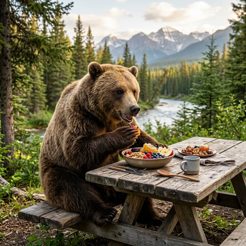 a bear eating breakfast.