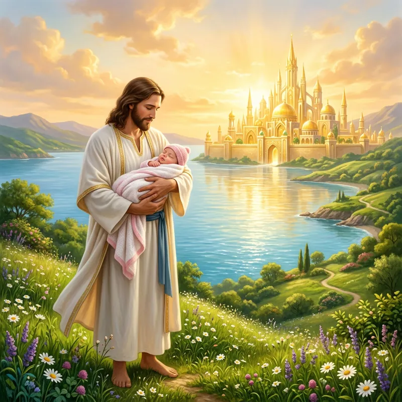 A beautiful early newborn babygirl in Jesus Arms in a golden City with seas and Green gras.