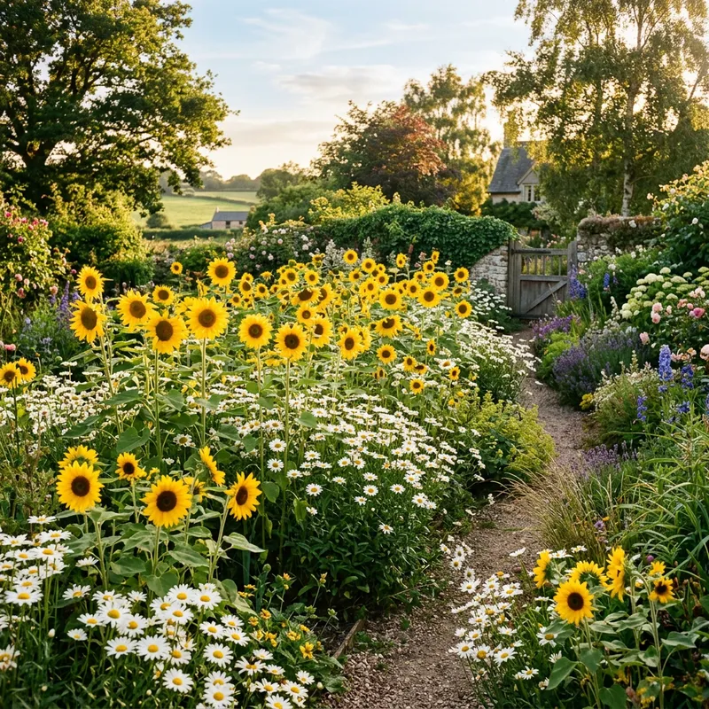 A beautiful garden filled with vibrant sunflowers and delicate white daisies, surrounded by lush greenery and bathed in warm sunlight. The scene is tranquil and colorful, highlighting the natural beauty of the flowers.