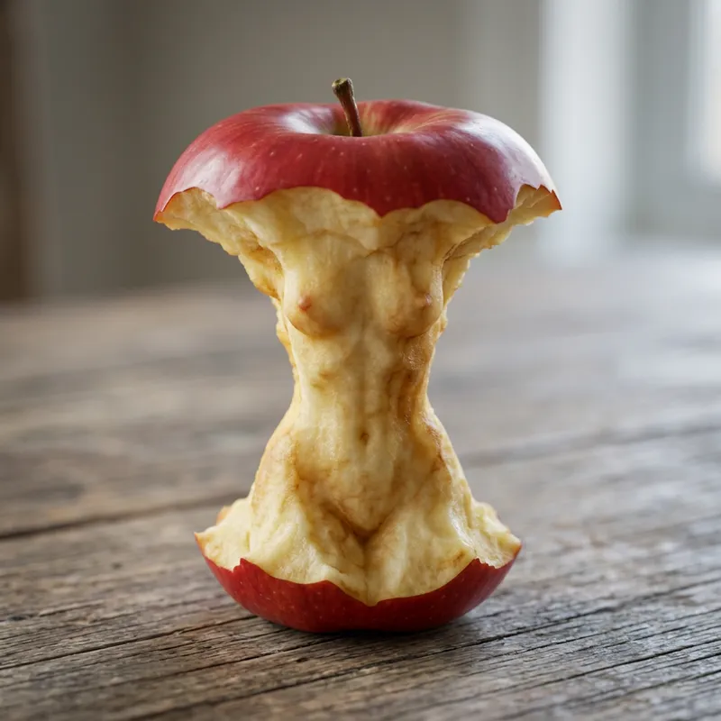 a beautiful red apple, gnawed on both sides, tapers to the center, the gnawed apple pulp has the shape of a naked female torso, a beautiful figure without a face and legs, a naked body, a slender waist, small breasts, a slightly raised body, the face and legs are not visible, an apple core in the shape of a female torso, above and below the apple is untouched and has a red peel, realistic image, soft light, hyperrealism.