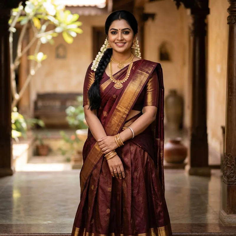 A beautiful Tamil woman, around 25 to 30 years old, with a perfect body shape, round face, and large hips. She has long, black hair neatly tied, deep black eyes, and sharp eyebrows. Her lips are naturally pink, slightly curved into a smile, but her white teeth are not visible. She has a traditional and homely appearance while wearing a modern yet elegant outfit that maintains a cultural essence. She is adorned with gold and platinum ornaments on her neck and hands, a simple ring on her finger, and a delicate gold anklet (kolusu) on her legs. The background is soft and warm, enhancing her graceful and dignified presence.