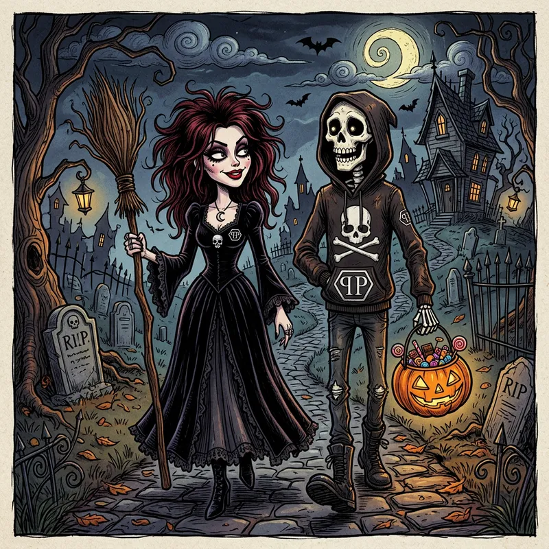 A beautiful witch girl with red lips, wearing a black dress with a small Philipp Plein emblem on her chest, holding a broom, and a skeleton guy in dark-colored Philipp Plein clothing holding a pumpkin-shaped basket filled with candy. The image is in the style of a Tim Burton cartoon.