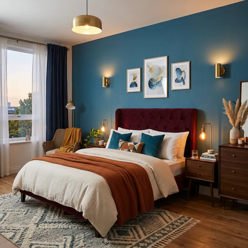 A bedroom featuring a burgundy headboard and a wall painted in teal blue. The room should have a cozy and modern aesthetic, with soft lighting, stylish bedding, and complementary decor elements.