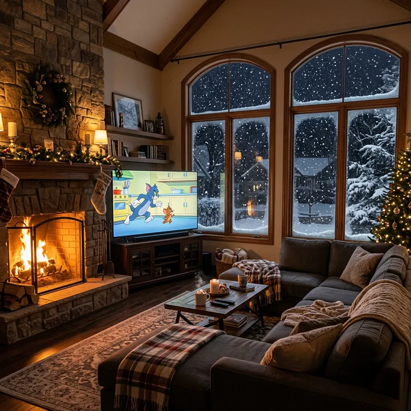 a big living room with two big windows snowing outside and snowflakes coming down the window a big TV Tom and Jerry show and the fireplace that looks cosy and warm