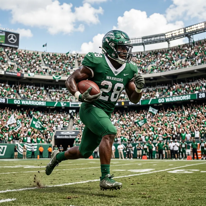 A Black male football player in his late twenties, wearing a green team uniform and a helmet. He's running on a grassy field, holding a brown leather football under his arm. The stadium is packed with cheering fans. The sky above is clear blue with some mild white fluffy clouds.
