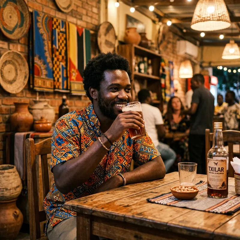 A Black man drinking txilar, a traditional Mozambican beverage, in a cozy setting. He is sitting at a table with a glass in hand, showing a relaxed and content expression. The background includes elements typical of Mozambican culture, such as vibrant textiles or rustic decor, with warm lighting enhancing the ambiance.
