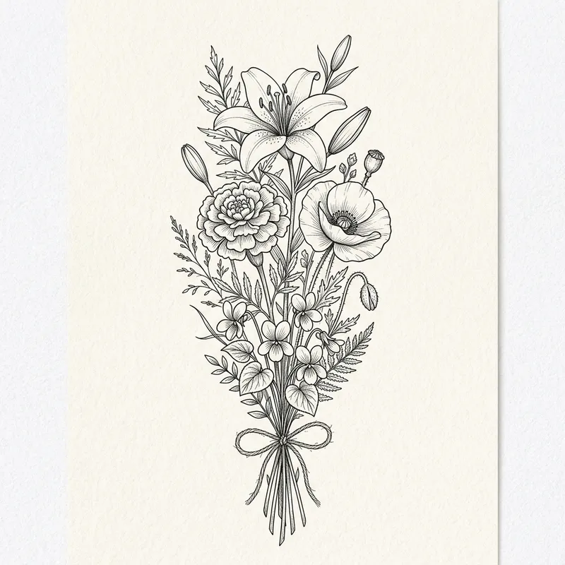 a black vertical fine line bouquet of flowers that has a violet, marigold, poppy and lily