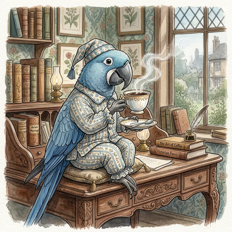 A blue glaucous macaw perched on a floating desk, wearing whimsical pajamas, sipping at a steaming cup of coffee. The charming scene is depicted in the style of a 19th century watercolour painting, paying homage to the intricate yet delicate illustrative techniques seen in Victorian era artwork.