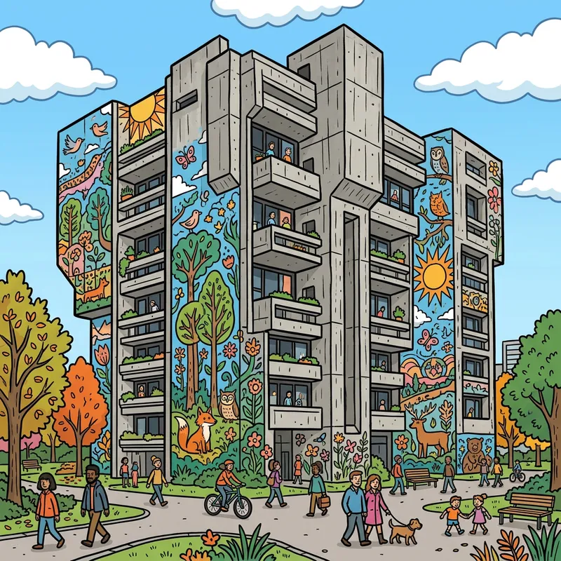a bold line cartoon of a brutalist building decorated with pretty mural paintings.