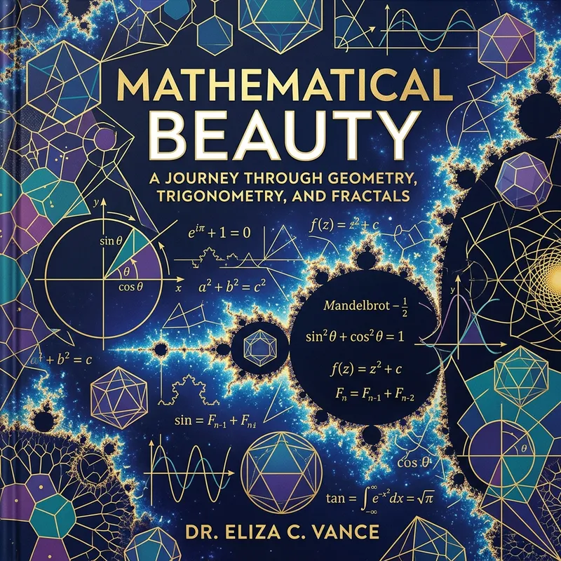 a book cover for mathematical book cover with geometric, trigonometric and fractal images and some of the beautiful mathemtical equation