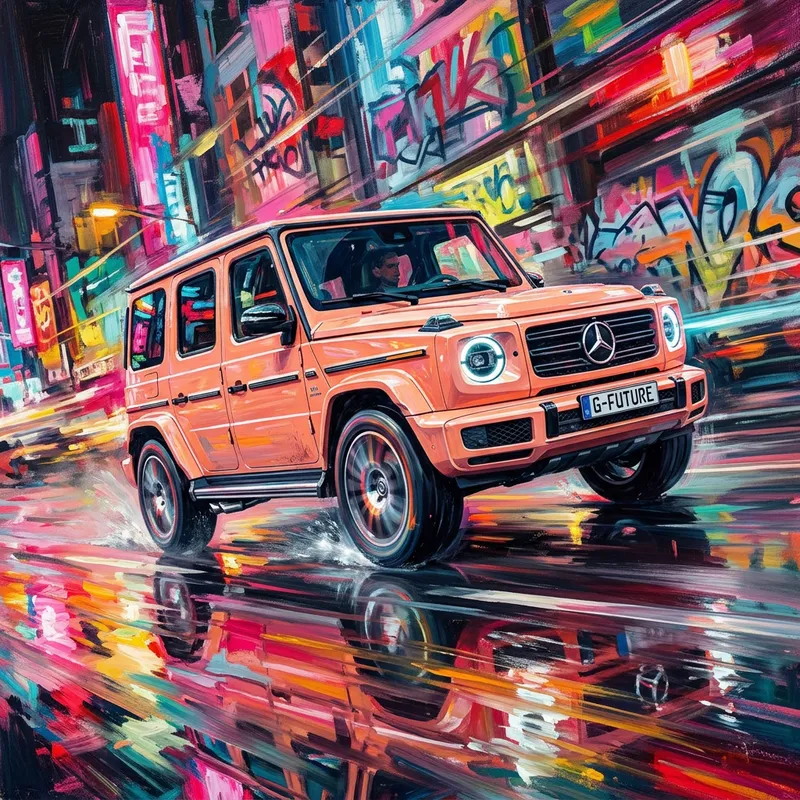 A bright, futuristic Mercedes G-Class, peach-colored, speeds through an urban landscape. The car is shown in motion, conveying a sense of speed as it glides over wet asphalt. Positioned centrally, it is turned to the right and slightly tilted. Reflections on the road create the illusion of water. The color palette explodes with bright pinks, reds, yellows, blues, oranges and greens. The style is reminiscent of modern painting or graffiti art, with crisp detailing and brushstrokes reminiscent of oil painting. Visible brushstrokes and blurring create a dynamic atmosphere. The background is bright, abstract colors, contrasting sharply with the car. The composition uses perspective to focus on the car, making the car the clear center of attention and emphasizing the sense of speed.