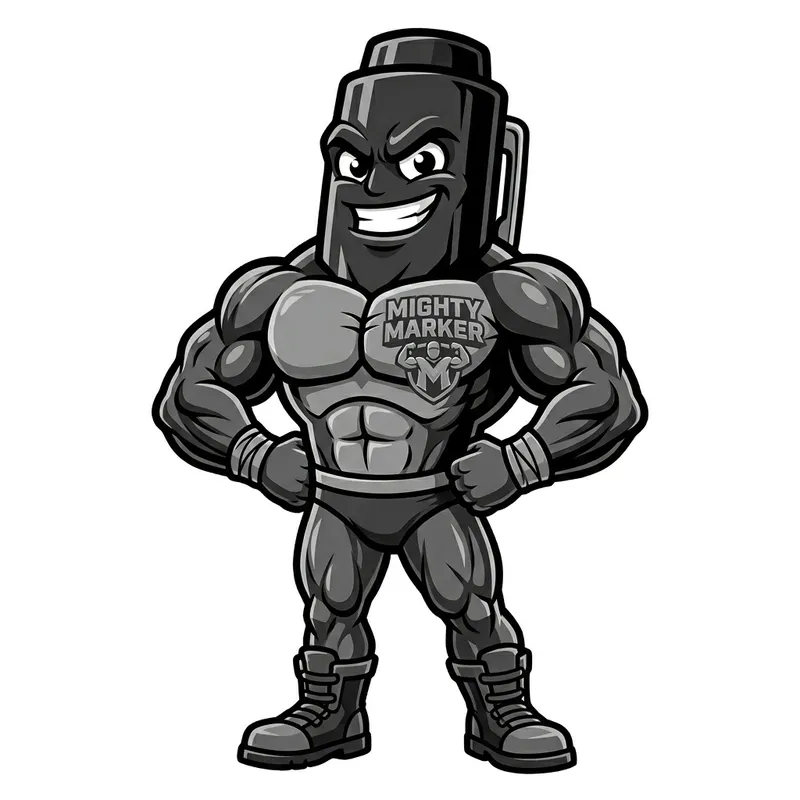 A cartoon mascot of a marker, designed to be muscular with a broad chest and strong arms. The marker has a confident grin on its face, showcasing a fierce yet approachable expression. The color scheme is black and gray, with no background. The character stands tall, emphasizing its strength and confidence.