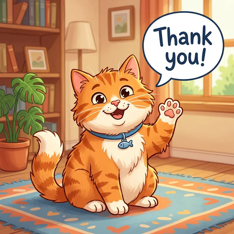 Original Prompt: A cartoon orange cat says "Thank you!"