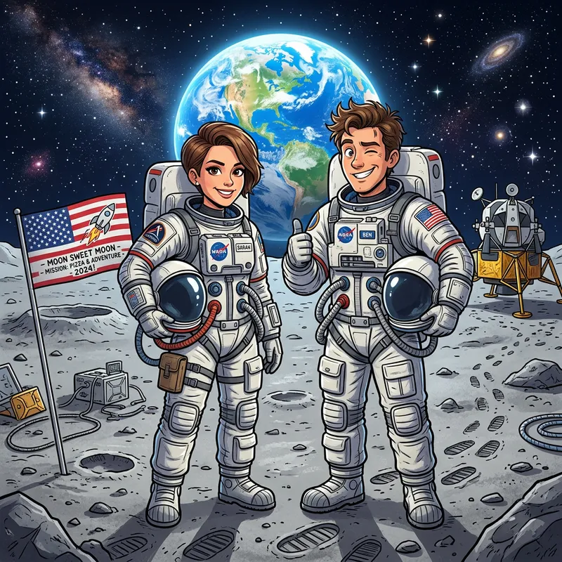 A cartoon-style illustration of two astronauts standing proudly on the Moon, wearing detailed and realistic space suits without helmets, fully revealing their faces. The female astronaut has a short, stylish haircut and a confident smile, while her partner stands beside her with a playful expression. Both are looking directly at the camera, surrounded by a starry sky and the Earth glowing brightly in the background. The setting has whimsical, yet detailed elements, including footprints on the Moon and a humorous flag they’ve planted.