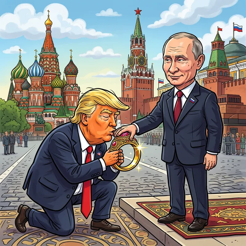 Trump Kneels to Kiss Putin's Ring in Cartoon Style