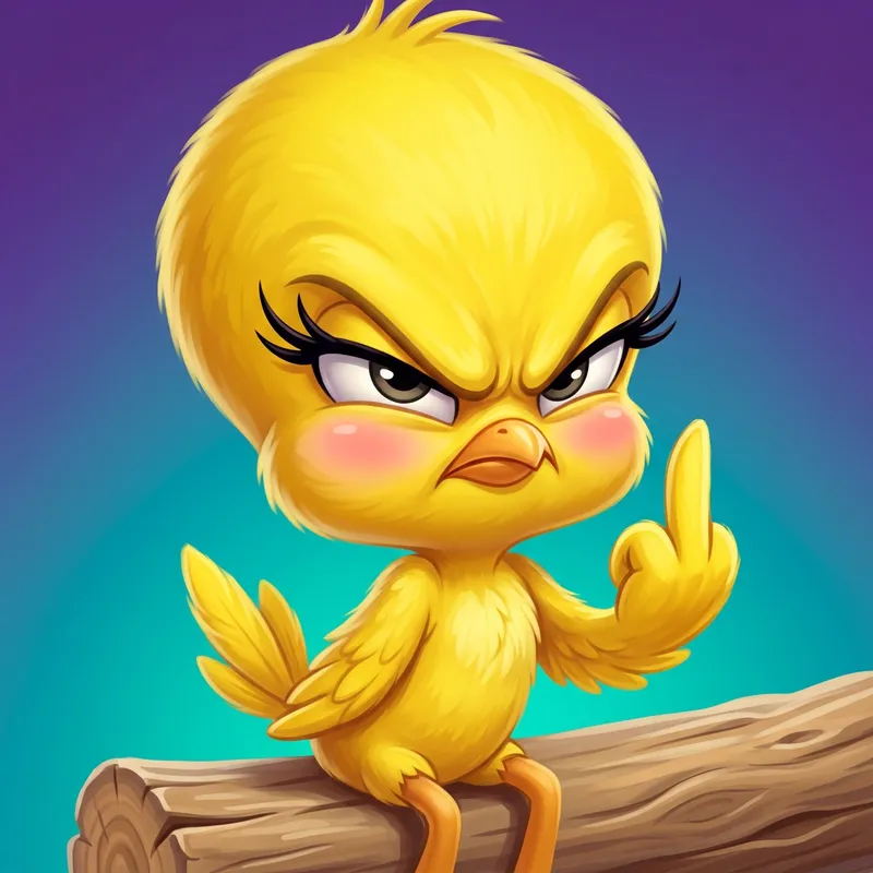 A cartoon-style image of Tweety Bird with an angry expression, giving the middle finger. Exaggerated feminine features like blush and thick eyelashes. Bright yellow plumage with highlights and detailed feathers. Perched on a light brown wooden log. Gradient background of purple and teal. Digital painting with smooth edges, emphasizing bold colors and a playful yet mischievous mood. Close-up perspective.