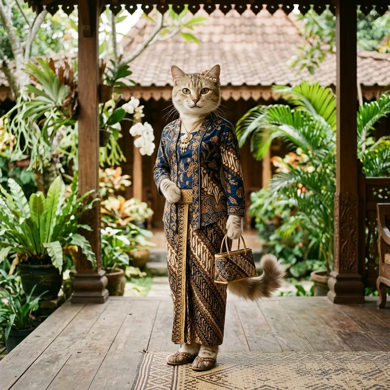 a cat but can stand like a human, wears typical Indonesian batik clothes and the character is female.