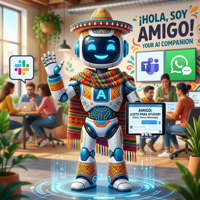 A cheerful and friendly mascot named 'Amigo' representing an AI application. The mascot should embody the themes of artificial intelligence, helpfulness, and Latin culture. Design a character that blends modern AI aesthetics with a touch of Latin flair—perhaps a humanoid robot with colorful Latin-inspired patterns, wearing a sombrero or a scarf. Ensure the mascot has a vibrant personality and is ready to assist in many communication platforms like Slack, Teams, and WhatsApp. Incorporate a cheerful expression and approachable vibe.