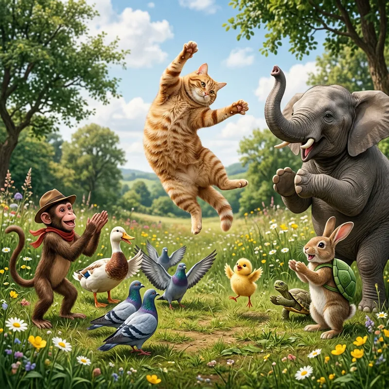 A chubby orange tabby cat is mid-jump, performing an impressive leap in the center of a lively animal gathering. A massive grey elephant, a waddling duck, a flock of pigeons, a fluffy chick-like bird, a mischievous monkey wearing a hat, a quick rabbit wearing a turtle shell backpack, and a tiny turtle are all standing around, clapping and cheering for the fat cat's acrobatic feat. The scene is set in a sunny meadow with a few trees and flowers, capturing the joy and excitement of the animal crowd.
