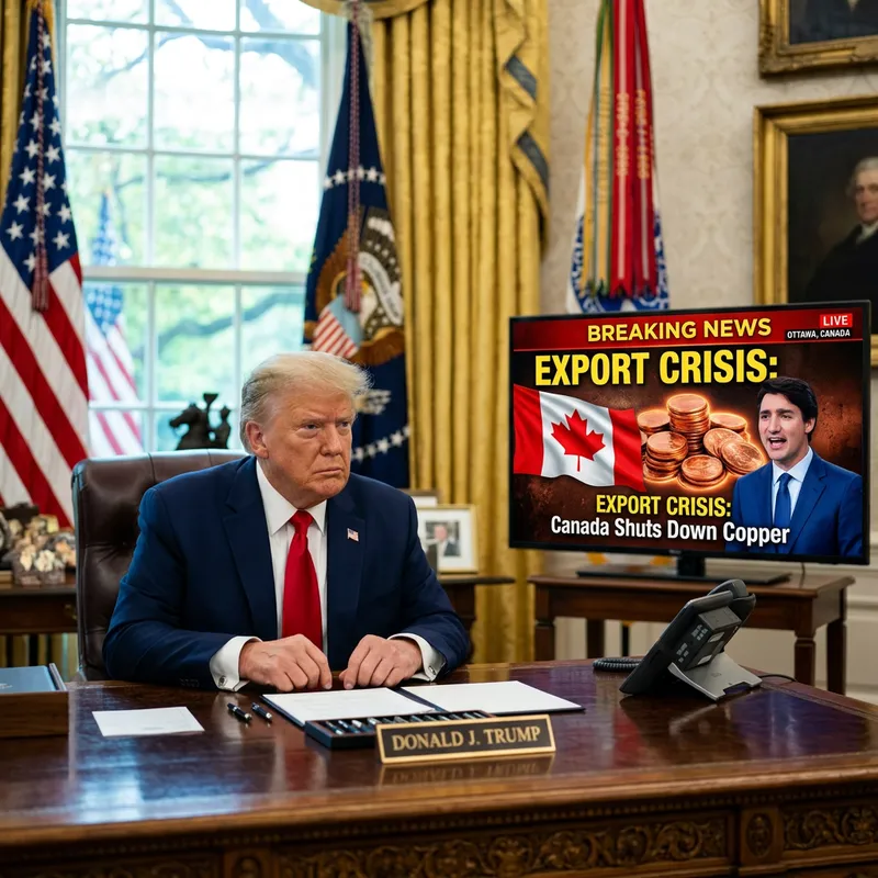 A cinematic, ultra-realistic image of Donald Trump sitting at a large wooden desk in the Oval Office, looking serious and slightly tense. He is wearing a dark navy suit, white shirt, and red tie, with his hands placed on the desk. Behind him, a window with soft daylight and golden curtains completes the background. On the right side of the frame, at a clear distance, a flat-screen TV is placed on a stand. The TV shows a dramatic news-style alert: A waving Canadian flag, a pile of copper coins, and a smiling Canadian official in a blue suit. Text on screen (bold red & yellow): 'EXPORT CRISIS: Canada Shuts Down Copper'. The overall look is clean, intense, and 4K cinematic ā perfect for a YouTube news/political thumbnail.