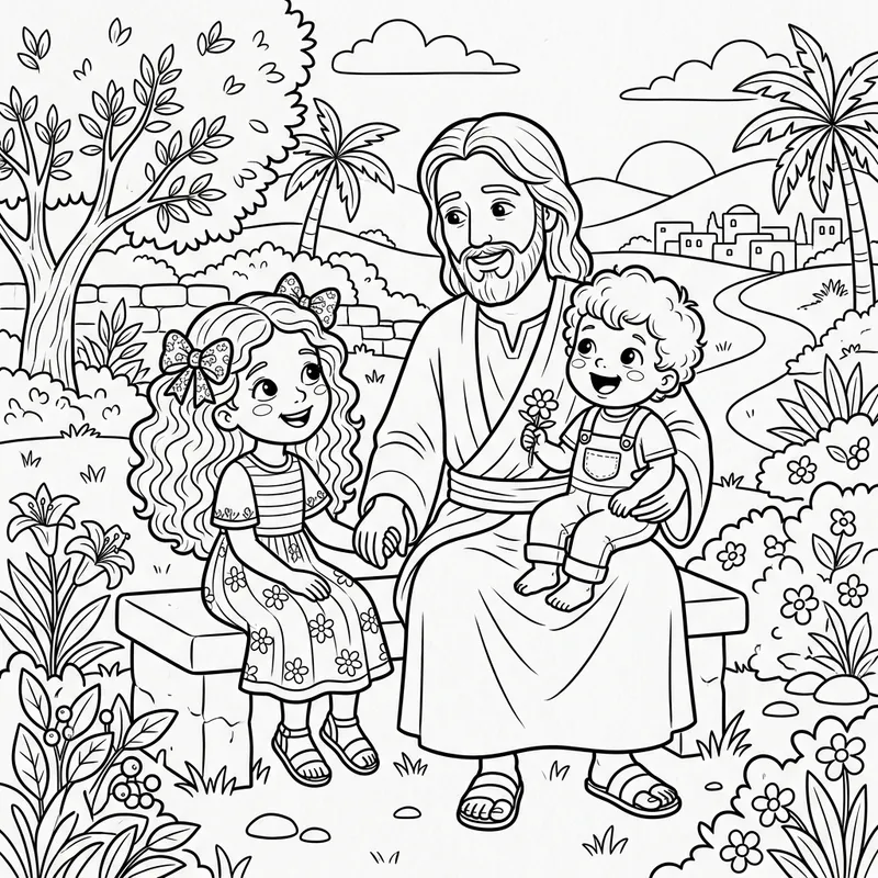 A coloring page of Jesus with a five year old girl who has long curly hair with bows and a toddler boy with big eyes and soft curls.