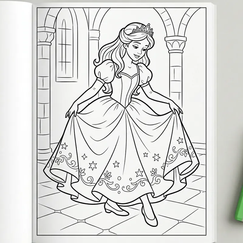 a coloring page of a princess curtsying