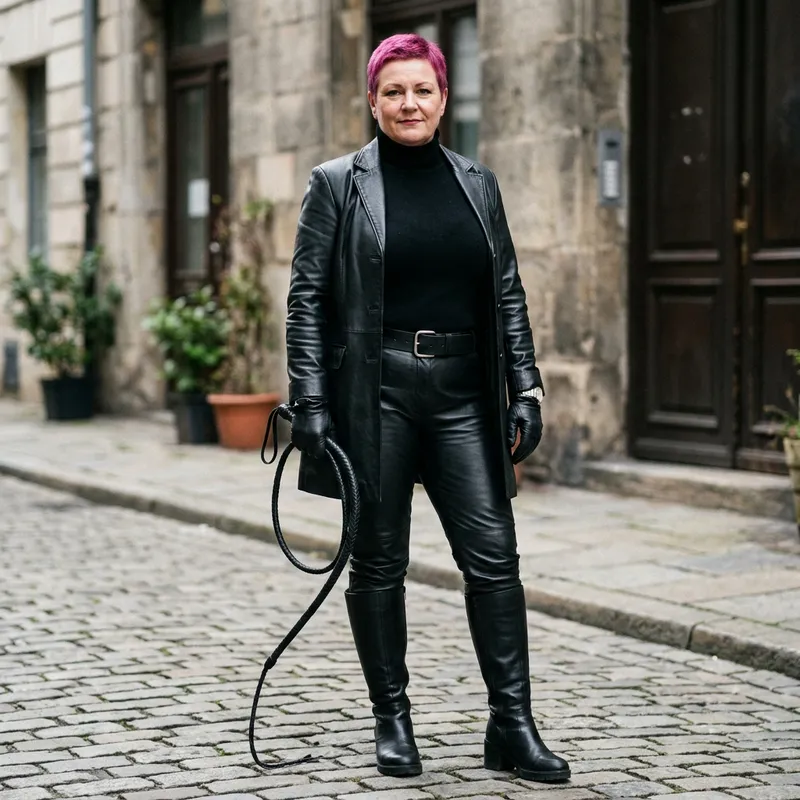 A commanding 50-year-old heavyset female dominatrix with very short pink hair, wearing a black leather outfit, standing confidently with a whip in hand and high-heeled boots.
