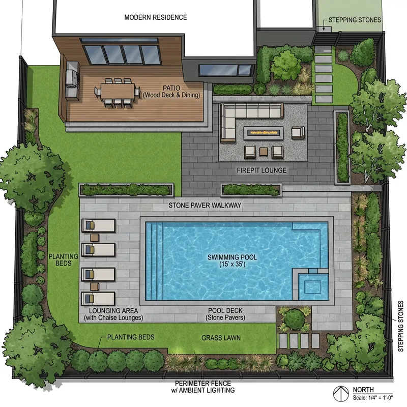 A conceptual layout of a backyard with a rectangular 15x35-foot swimming pool positioned close to the fence. The pool area includes a pool deck with lounging chairs on one side and a walkway leading to a hardscaped area closer to a house. The hardscaped area features a seating space with outdoor furniture and a potential firepit. Soft landscaping with grass, shrubs, and planters surrounds the pool and integrates with the fence. The design should emphasize a modern look with clean lines, stone pavers, and ambient lighting. Scale consistent with a 1/4-acre lot.