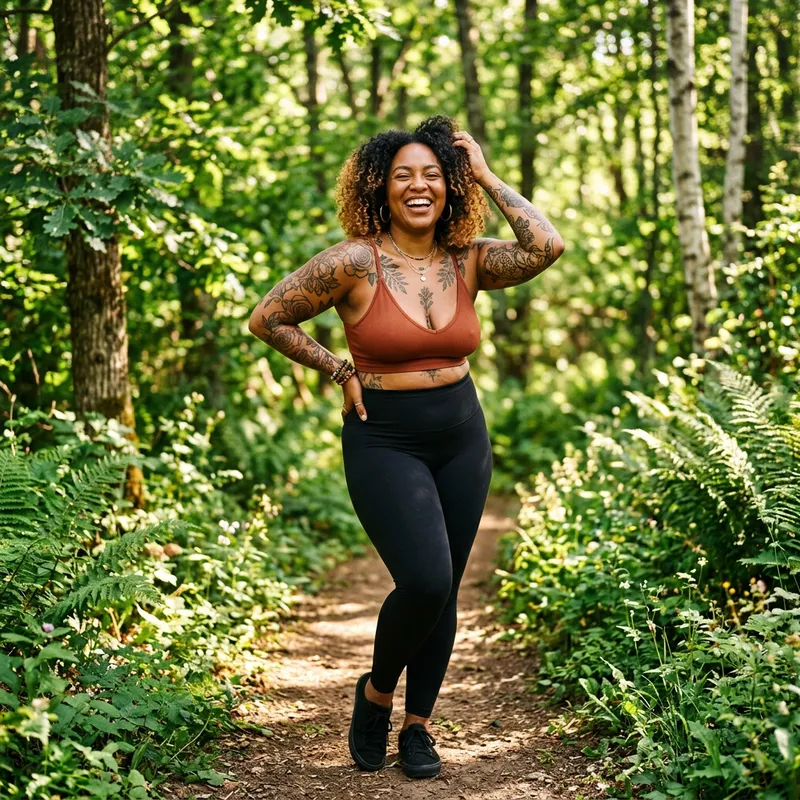 A confident, curvy Black woman with warm brown skin, shoulder-length curly ombré hair (black to caramel), intricate floral and geometric tattoos on her chest, arms, and shoulders, wearing a fitted rust-colored bralette and high-waisted black leggings, posing playfully in a sun-dappled forest glade with lush green foliage.