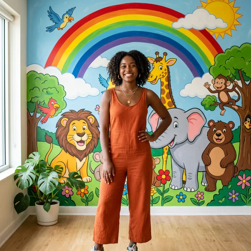 A confident young woman standing indoors in front of a colorful wall with cartoon animals and a rainbow.