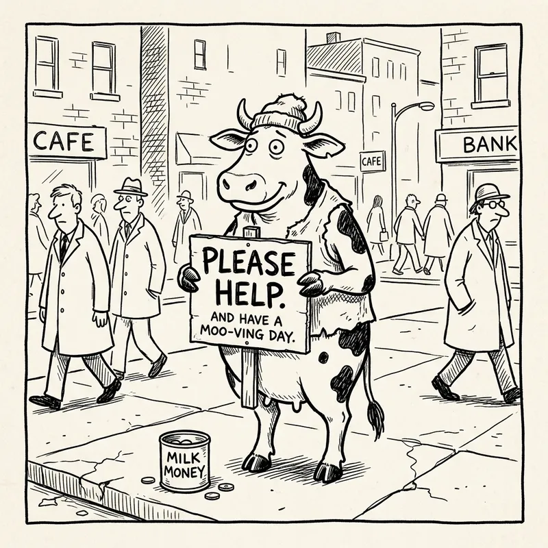 A cow begging for money holding a sign that says Please Help. styled in the iconic black and white minimalism of The Far Side, whimsical expressions.