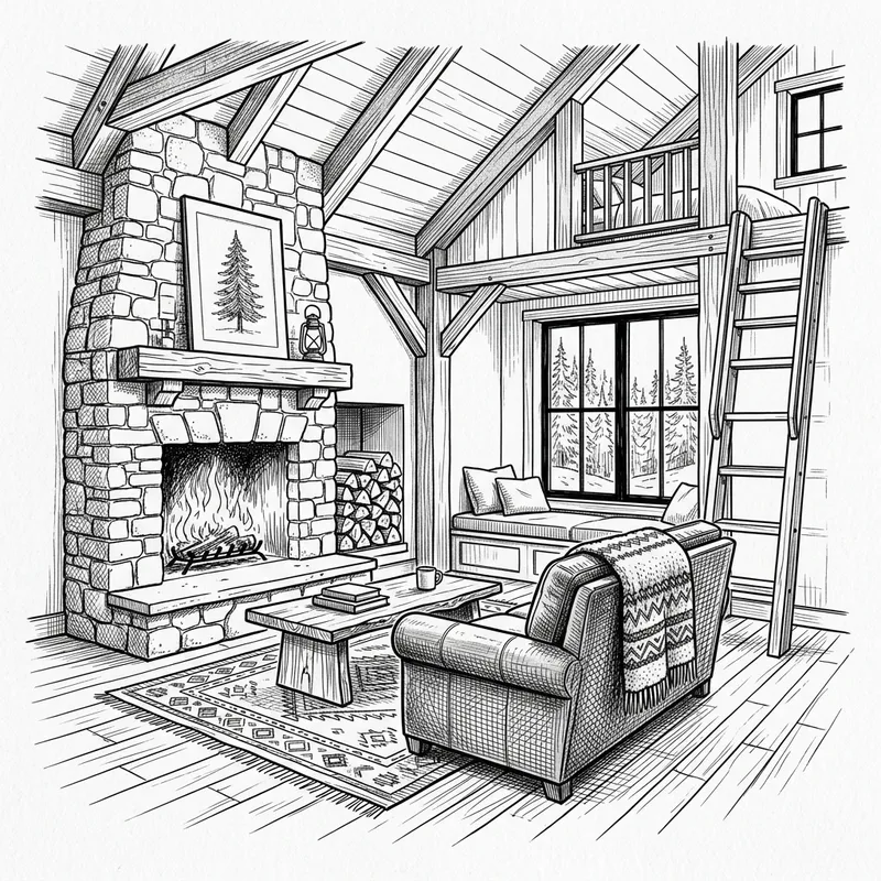a cozy cabin interior, award winning design, black and white sketch, white background