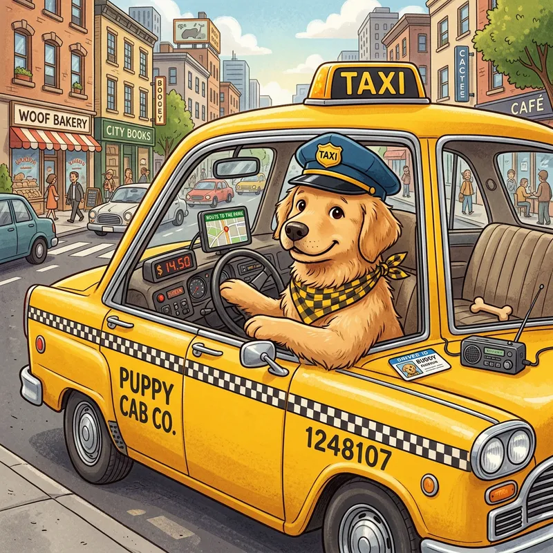 A cute and detailed drawing of a dog as a taxi driver in a yellow taxi