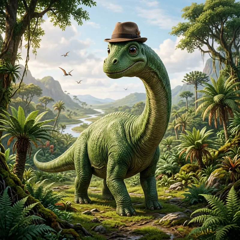 An adorable dinosaur is seen wearing a hat. It is a prehistoric creature, characterized by its massive size and unique features. The hat perched adorably on its head adds a touch of whimsy to the scene. Lawn green scales cover its body, while its large, round eyes exhibit an innocence that's rare for a creature of its size. The hat, a piece of classic headwear, sits snugly on its head, providing a stark but amusing contrast to its ancient, formidable figure.