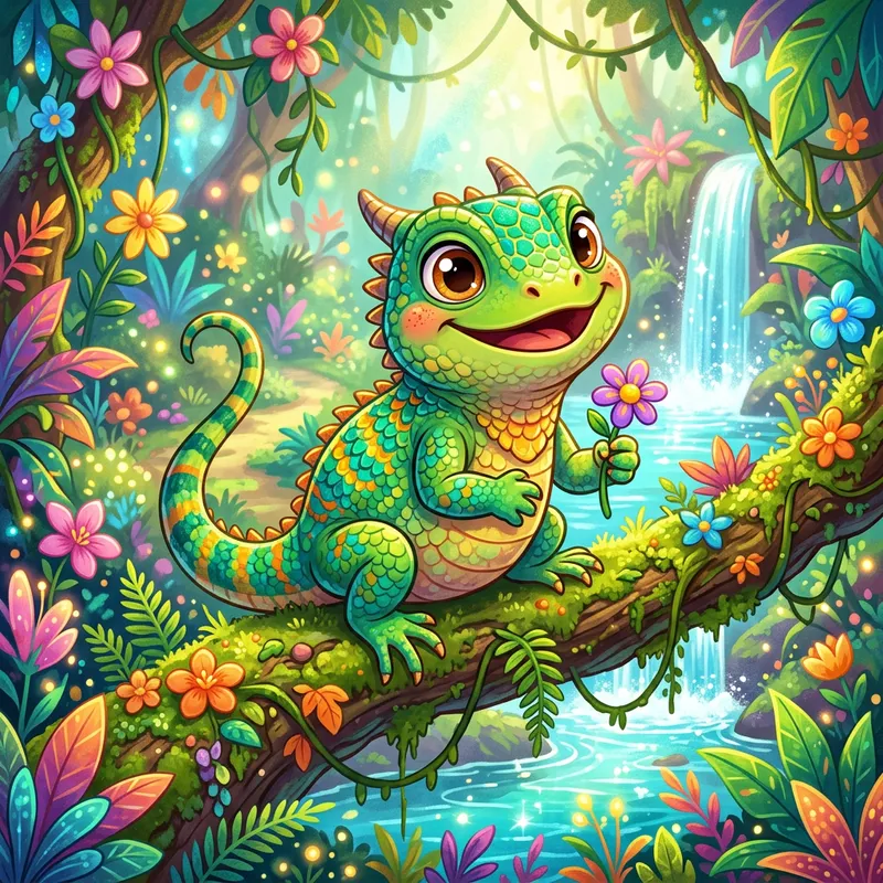 a cute lizard, cartoon style, bright colors, friendly expression, detailed scales, vibrant background.