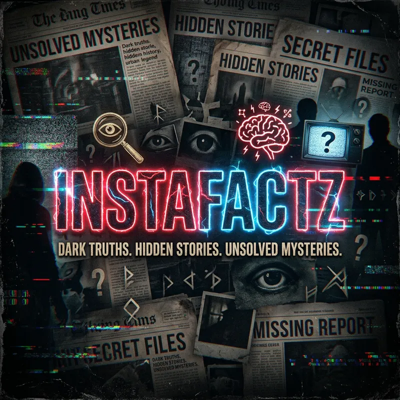 A dark, mysterious YouTube banner design with glitch effects, faded newspaper textures, and a mix of vintage and digital elements; bold text “InstaFactz” glowing in neon red or electric blue, background includes shadowy silhouettes, question marks, eyes, and symbols like 🔍📺🧠, dramatic cinematic lighting, suitable for a fact-based short content channel about dark truths and hidden stories.