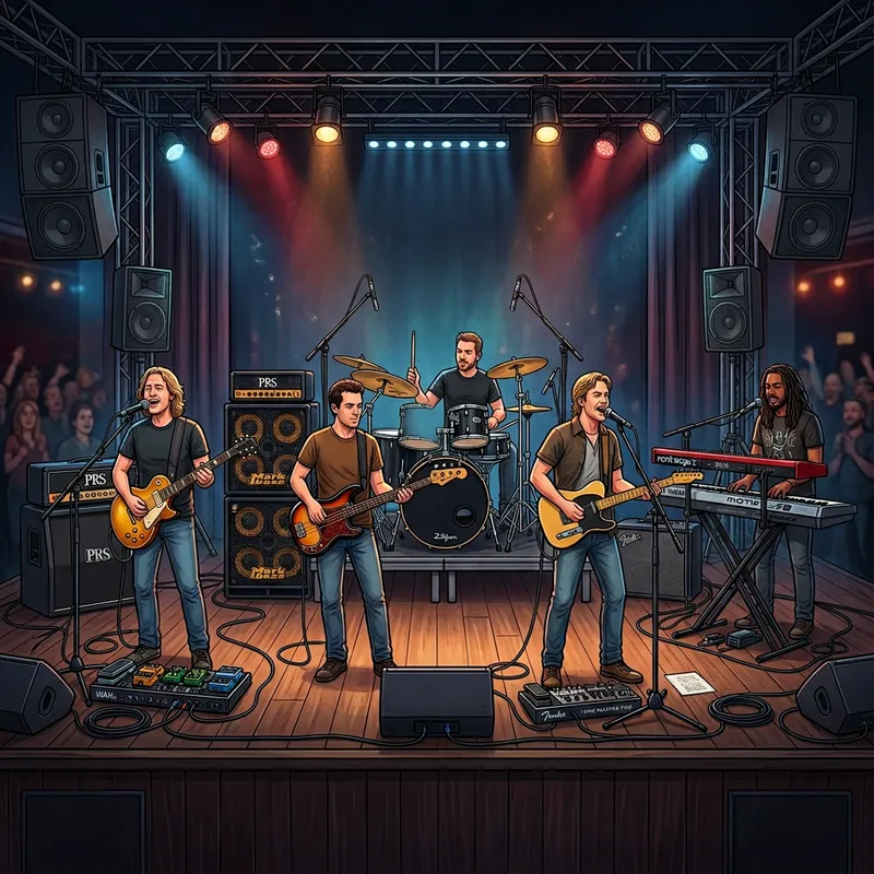 A detailed illustration of a stage setup for a 5 piece classic rock band. Left to right is Bob on guitar, Robert on bass, Mark on drums, Randy on guitar, and JJ on keyboards. Bob, Randy, and JJ sing and have microphones. Bob plays a Les Paul, uses a pedal board, and uses a PRS amp. Robert plays a Fender Precision Bass through two MarkBass cabinets. One is 4x10, the other 2x10 with a PRS head. Marks drums are black. One mounted tom tom, one floor tom tom. Randy plays a butterscotch Telecaster and uses a Fender Tone Master Pro pedal board and a Fender FR-12 amplifier. JJ uses two keyboards on a stand and various floor pedal units. There are tripod mic stands in front of Bob, Randy and JJ. On both sides of the stage are 2 tripod mounted speakers for audience sound projection, as well as 2 side fill tripod mounted speakers. All the crucial cables and connections are neatly organized.